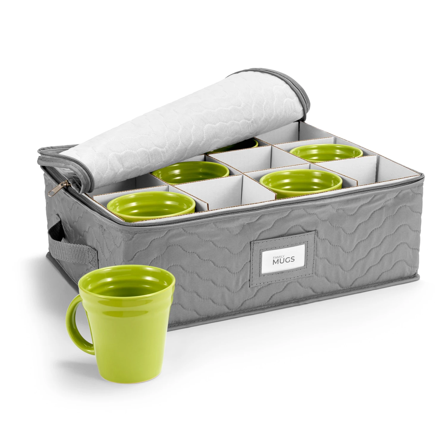 - Holds up to 12 of your favorite mugs. Features label windows, handles, and dividers