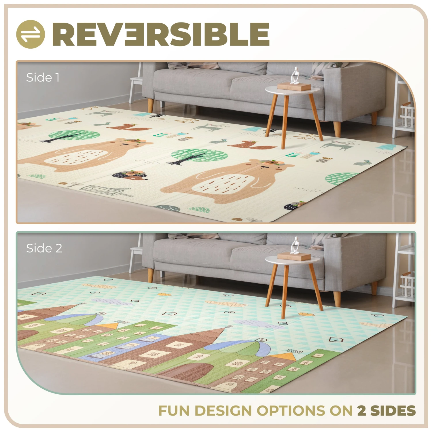 Experience double the fun with the Sorbus Play Mat’s reversible design! Featuring two engaging patterns on either side, this mat allows you to easily switch up the look and feel of your child’s play area. Each side showcases a vibrant, playful scene to spark imagination and adventure. This dual-sided functionality not only adds variety to playtime but also extends the mat’s usability, providing fresh, exciting environments for your little ones to explore.
