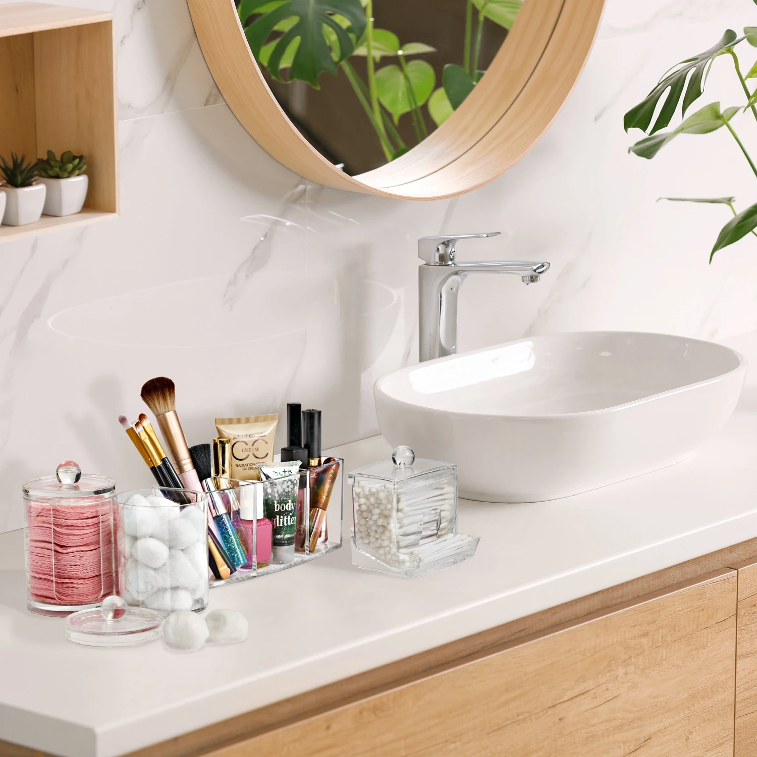 - Multifunctional Usage: Versatile design accommodates various bathroom essentials like cosmetics, skincare, makeup brushes, and more, doubling as a Q-Tip dispenser, makeup brush cup, or hairbrush organizer.