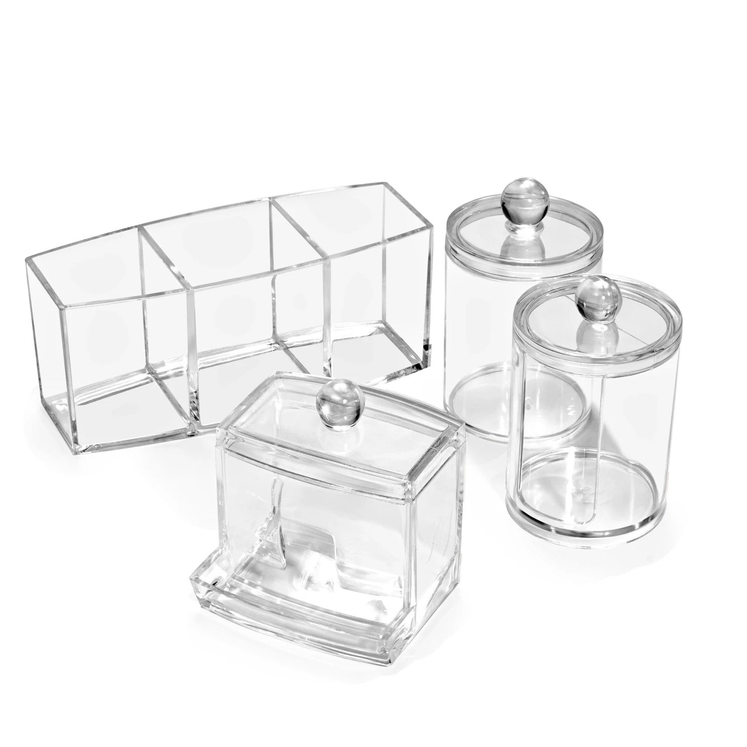 - Product Details: Set includes one Q-Tip dispenser, one cotton ball holder, one cotton pad dispenser, and one makeup brush holder, with measurements detailed for each component.