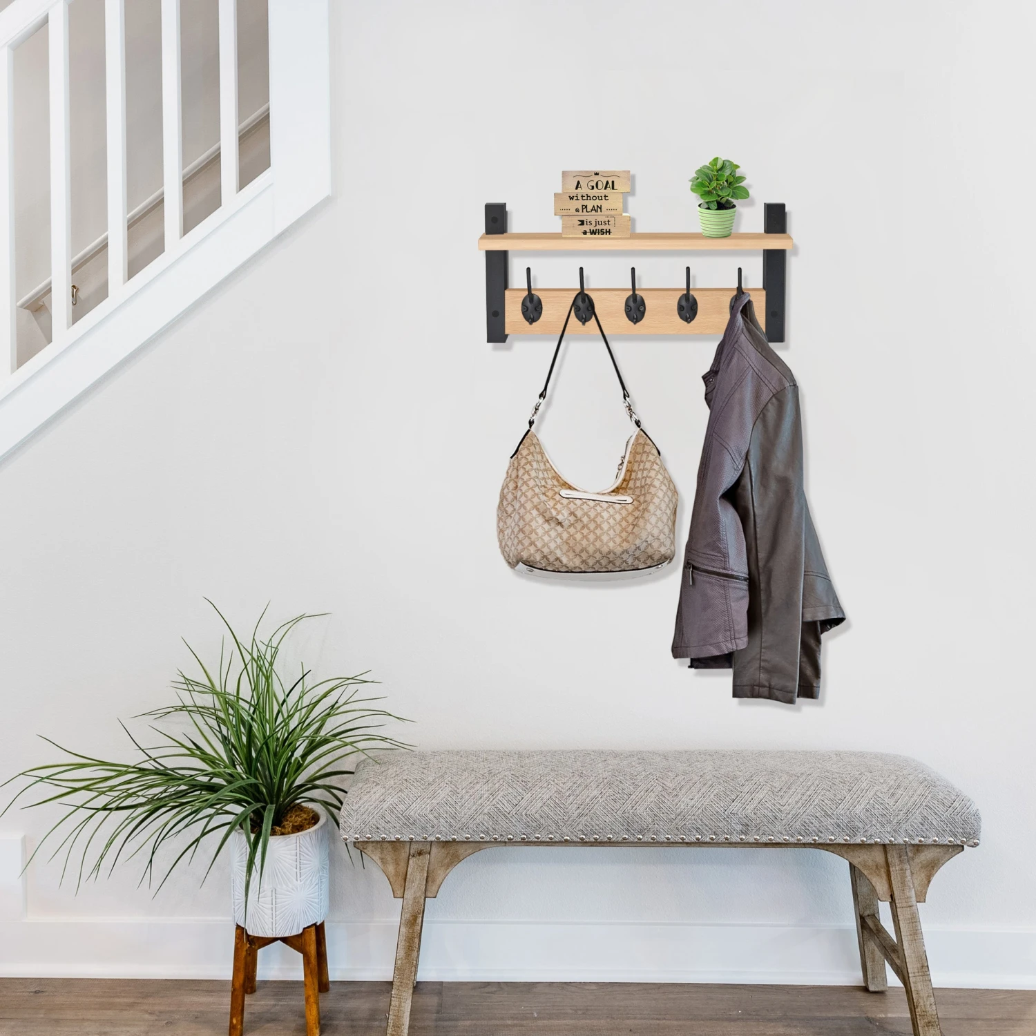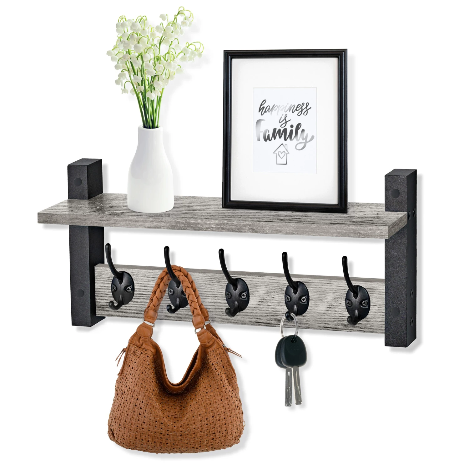 Add both elegance & everyday function to your walls with this wall mount floating shelf with 5 hooks. Designed with versatility in mind, this sleek & compact wall rack accordion wall hanger hook rack makes the perfect addition to your entryway, bathroom, kitchen, mudroom, or even bedroom. The shelf is deep enough to hold picture frames, candles, or a small potted plant, while the 5 heavy-duty metal hooks offer ample hanging storage for coats, scarves, bags, or hats.