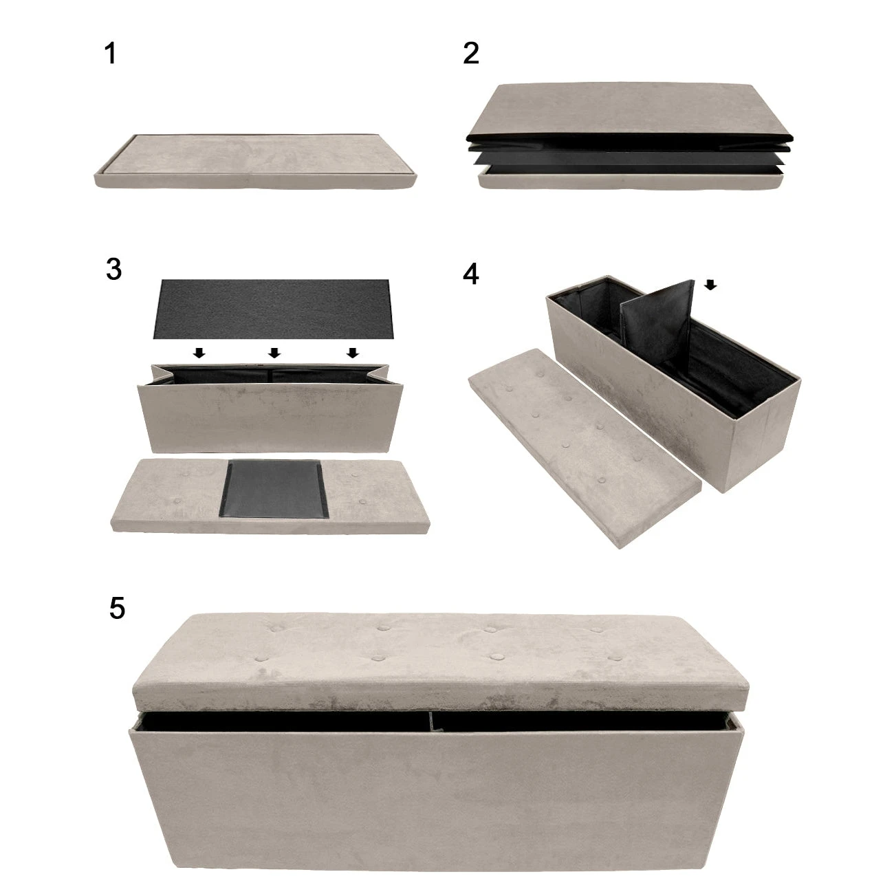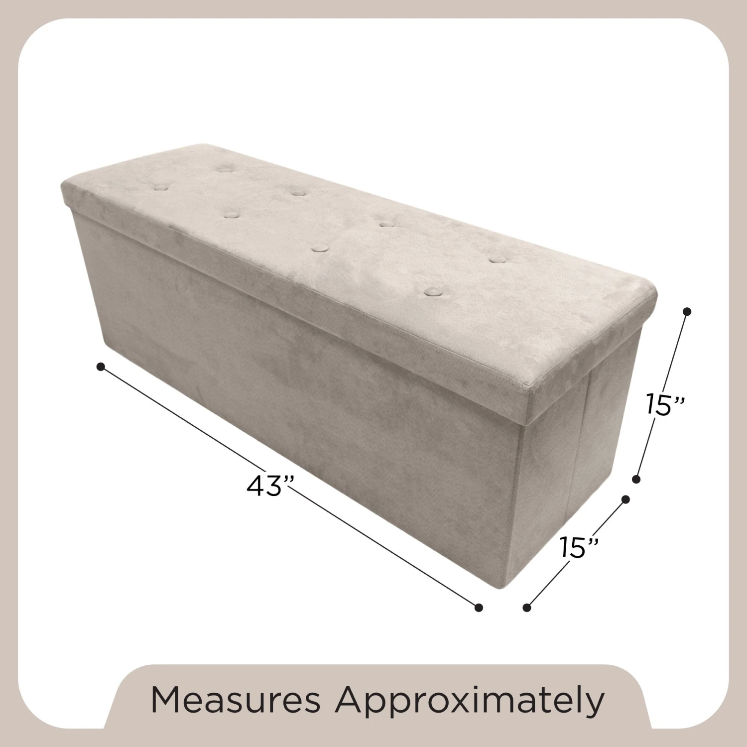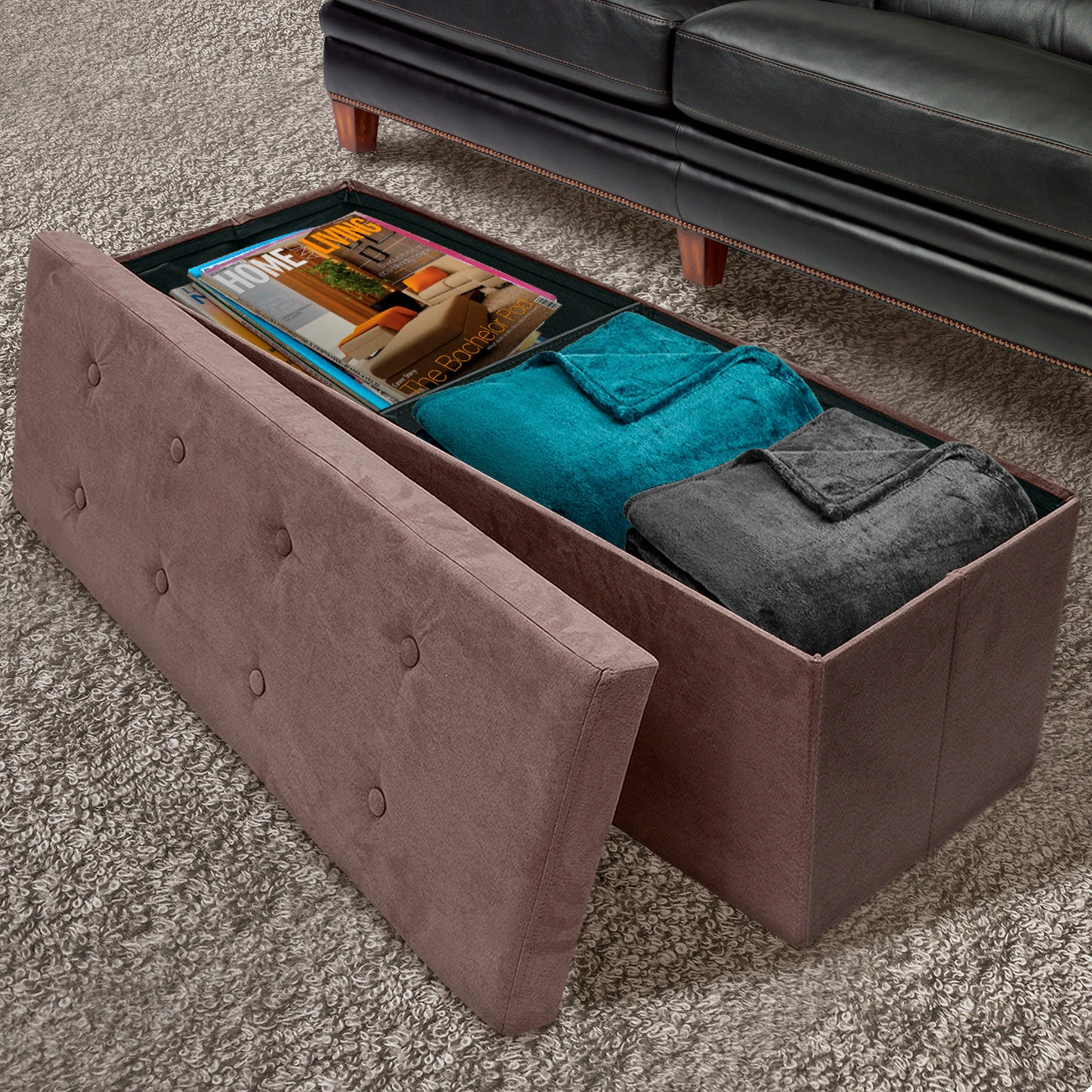 Our classic Storage Bench Chest is an attractive accent piece and functional storage compartment. Designed with superior faux suede, this multi-purpose bench features cushioned padding for seating, meticulous top stitching, and classic summary-tufting details. For storage, use it to stow small pillows, blankets, magazines, clothes, crafts, linens, and more. To use, simply lift the lid on the storage bench to stow or retrieve items. Assembly is quick, easy, and no tools are required. When not in use, simply fold flat for easy storage. Keep in your home, office, or college dorm for stylish organization.