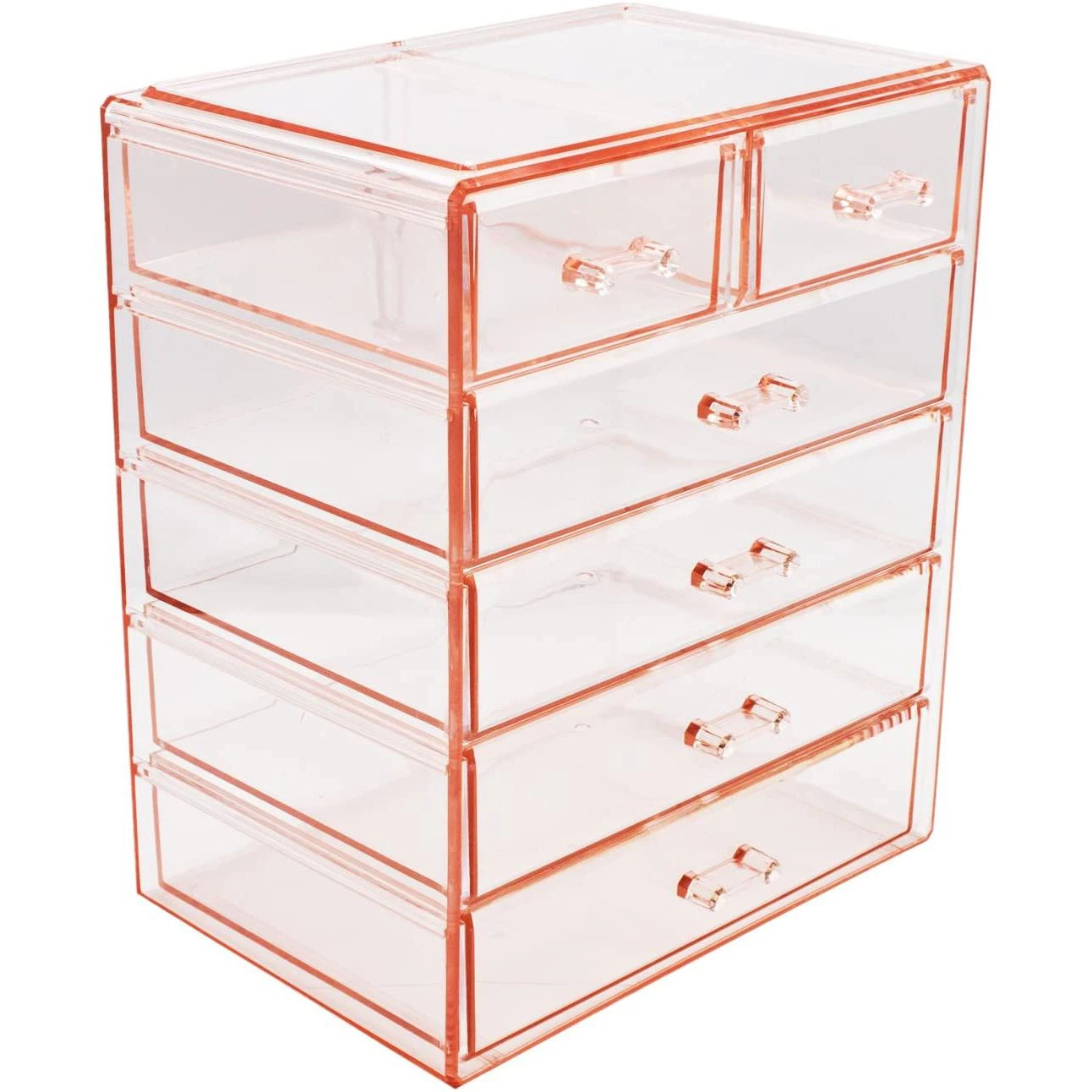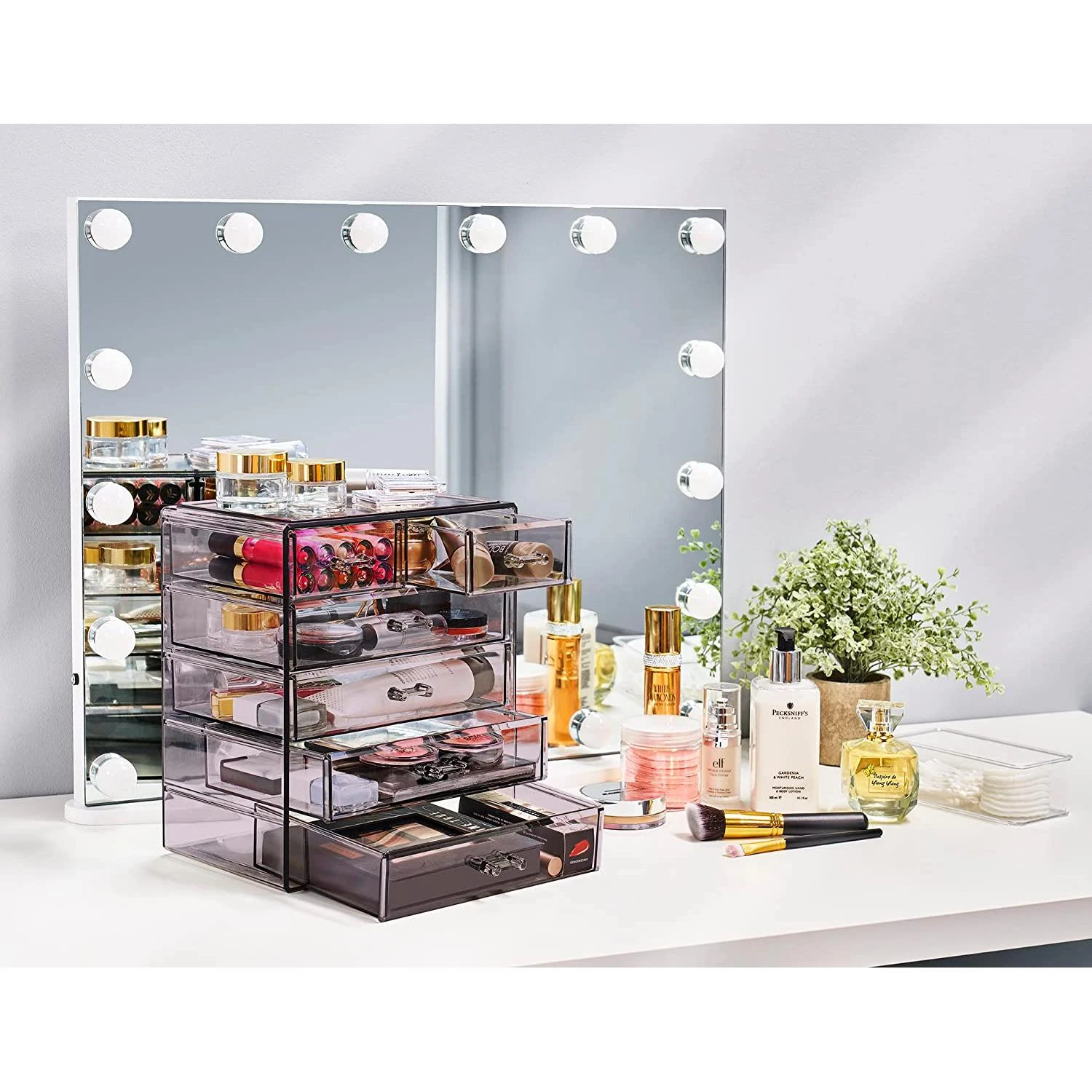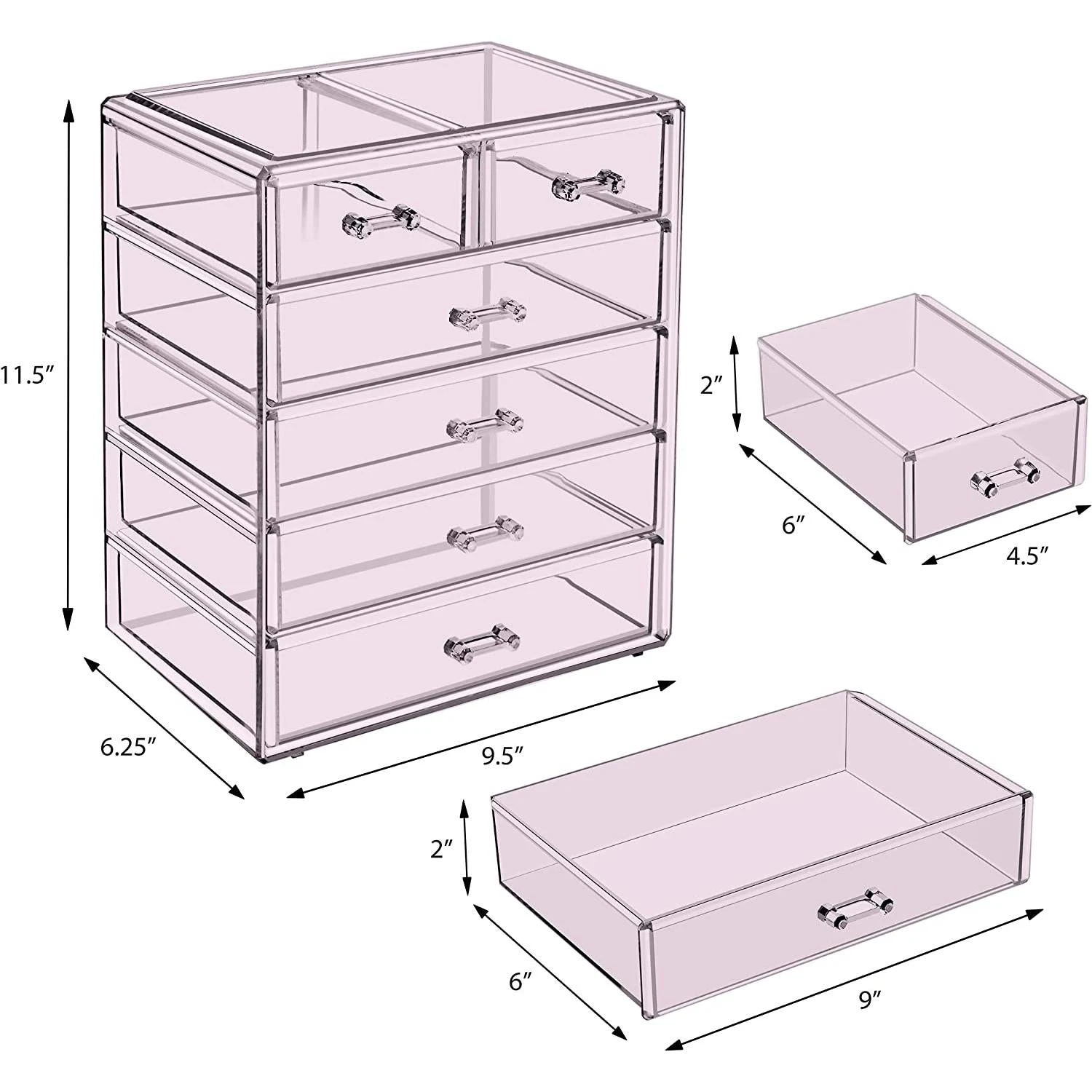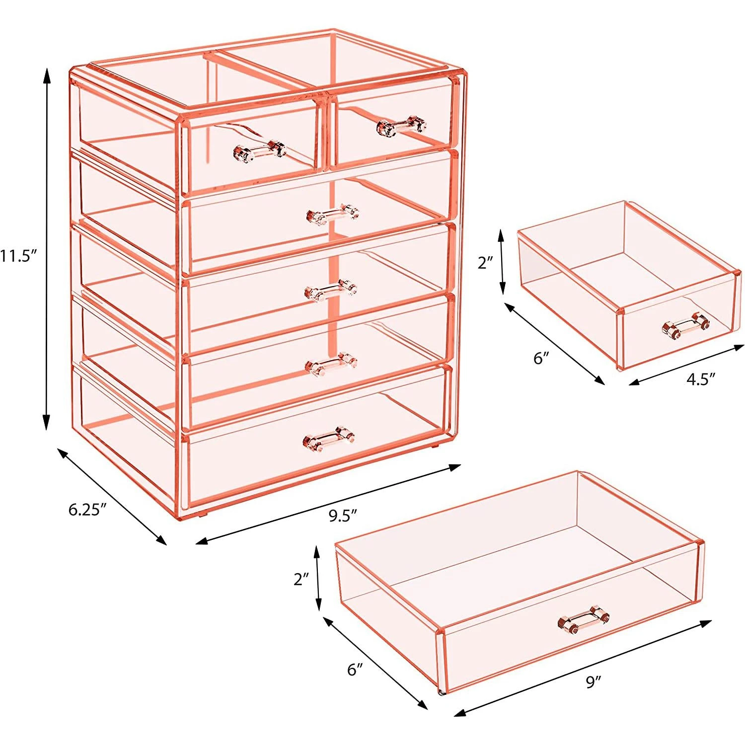 Turn your loose makeup into your very own beauty counter! This drawer organizer features clear construction to store your products with an effortless view. Four drawers on the bottom are ideal for oversize cosmetics, while the top two drawers hold smaller items. Drawers slide open smoothly and handles are easy to grip. Removable black mesh padding is included to keep items protected and in place. With an interchangeable design, it stacks and/or coordinates with other Sorbus organizers as your collection grows. Don’t limit your imagination to beauty needs! Crafts, grooming tools, jewelry, and other personal items can be beautifully organized within these drawers. For convenience, you’ll always see your products right when you need them most while adding a chic display to your countertop. (Makeup NOT INCLUDED).