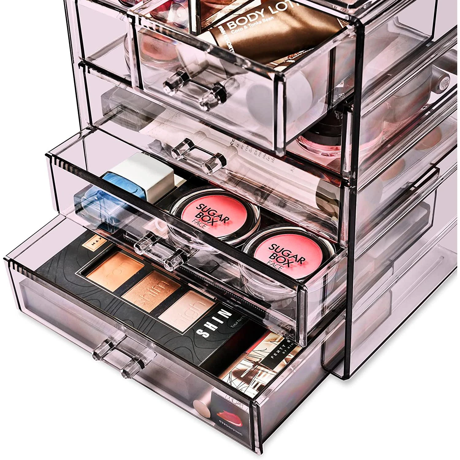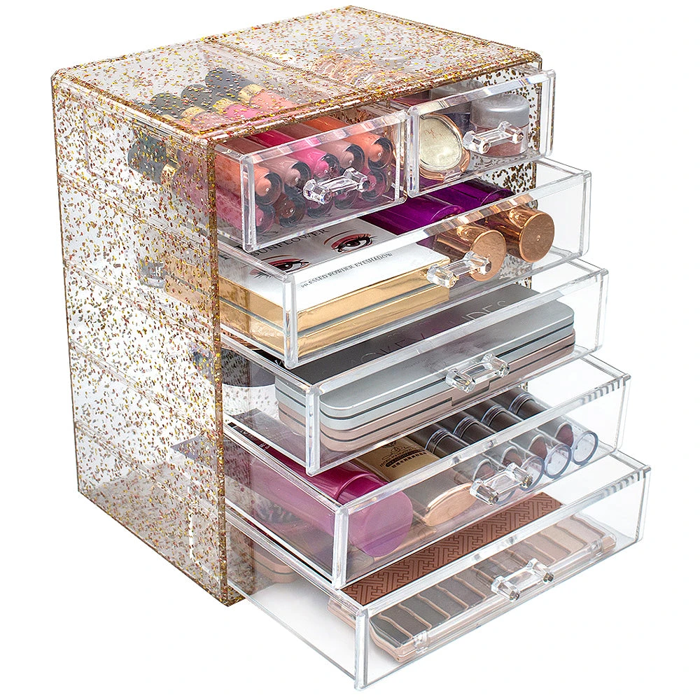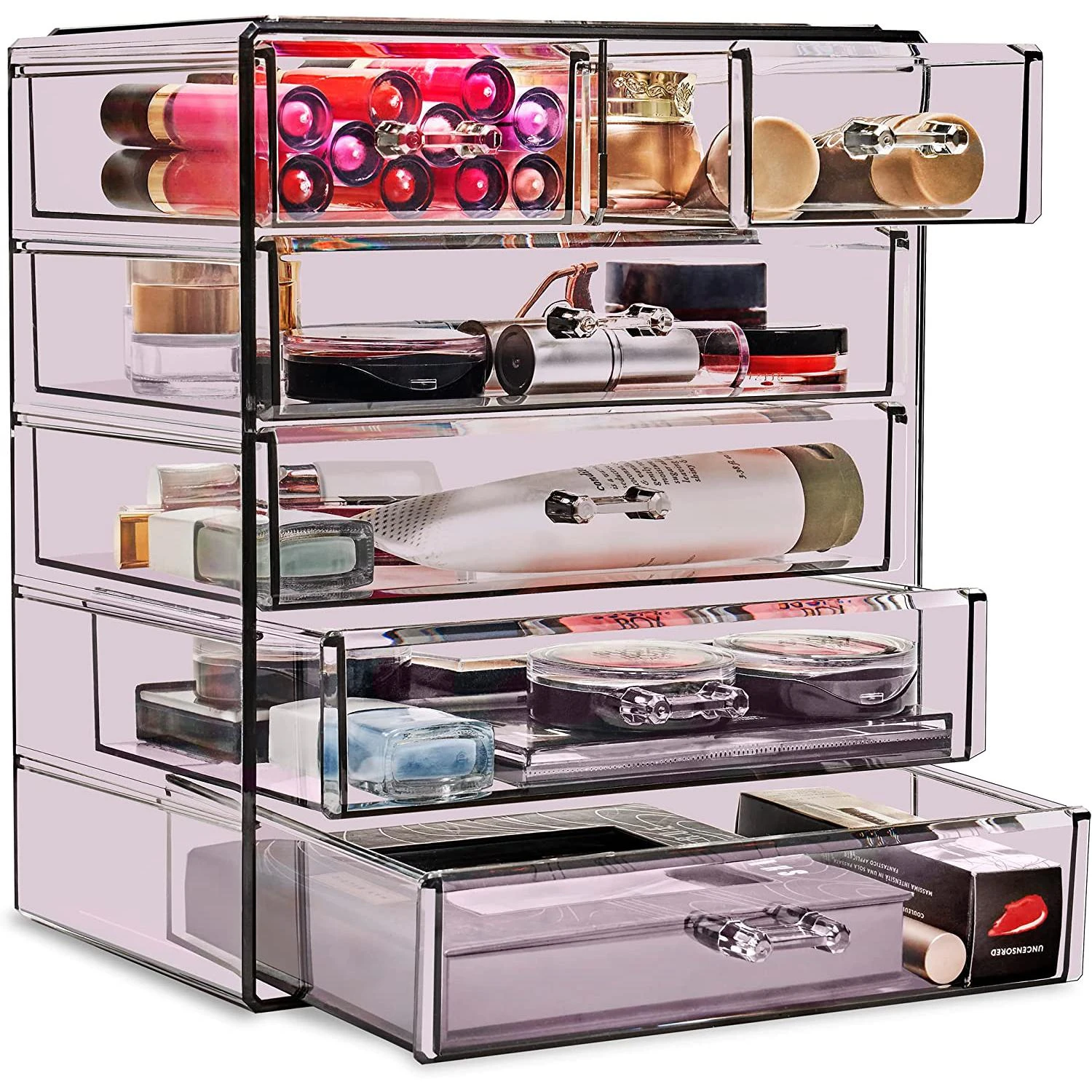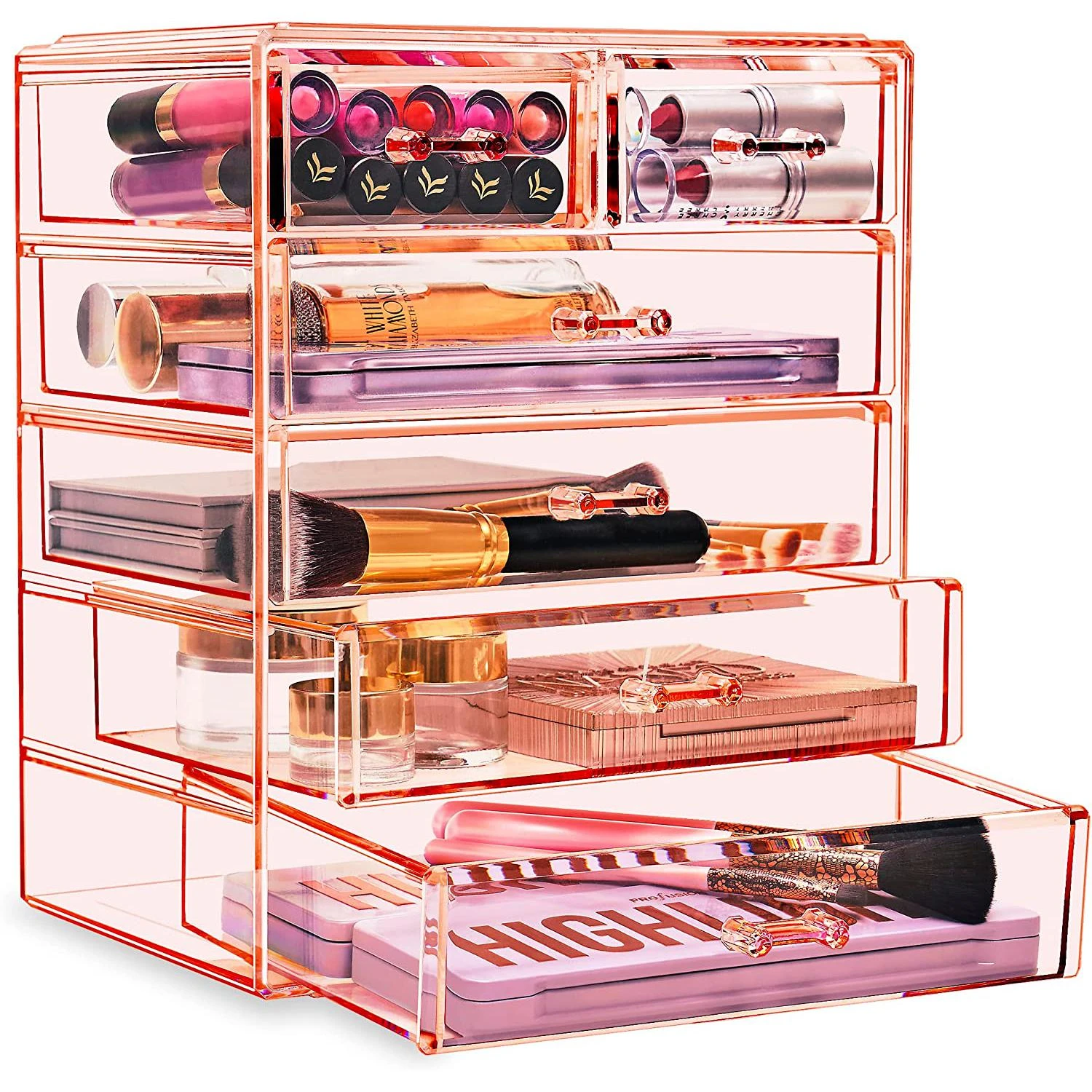 Turn your loose makeup into your very own beauty counter! This drawer organizer features clear construction to store your products with an effortless view. Four drawers on the bottom are ideal for oversize cosmetics, while the top two drawers hold smaller items. Drawers slide open smoothly and handles are easy to grip. Removable black mesh padding is included to keep items protected and in place. With an interchangeable design, it stacks and/or coordinates with other Sorbus organizers as your collection grows. Don’t limit your imagination to beauty needs! Crafts, grooming tools, jewelry, and other personal items can be beautifully organized within these drawers. For convenience, you’ll always see your products right when you need them most while adding a chic display to your countertop. (Makeup NOT INCLUDED).