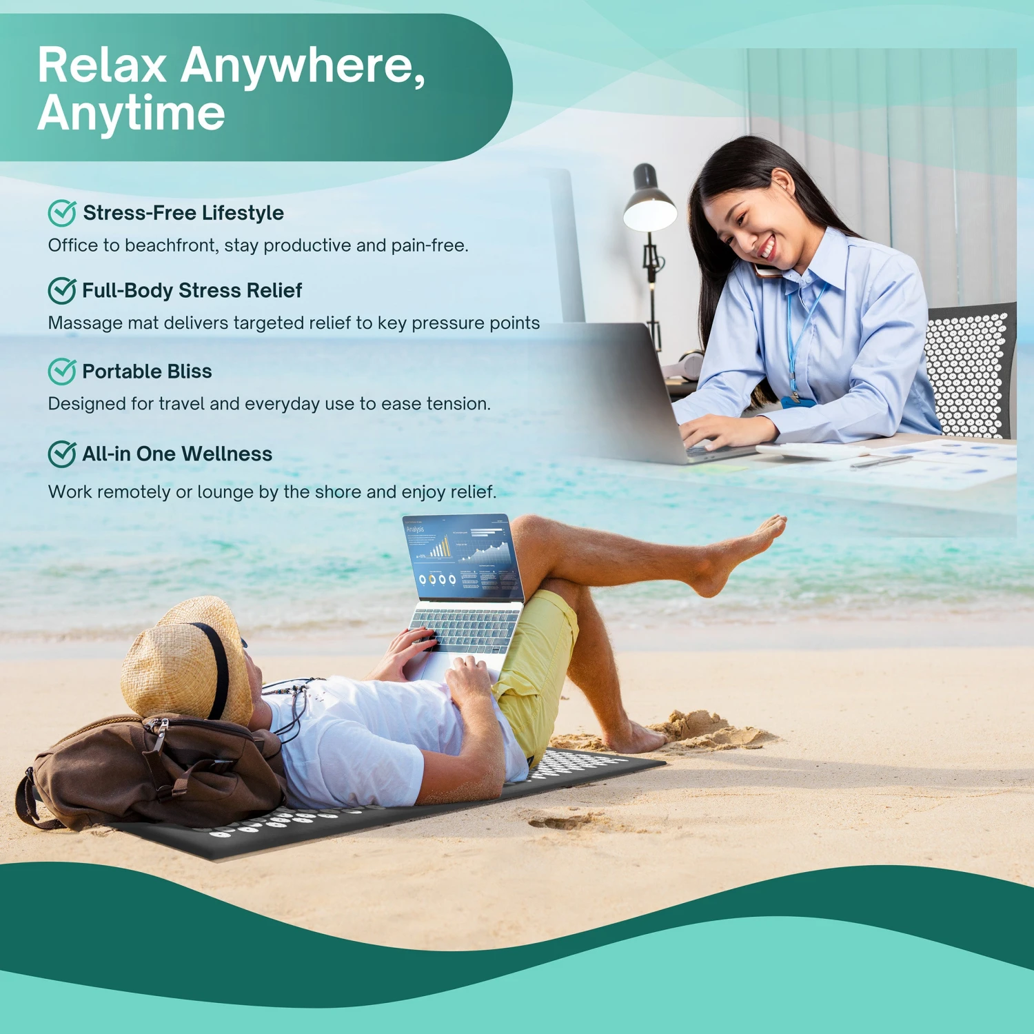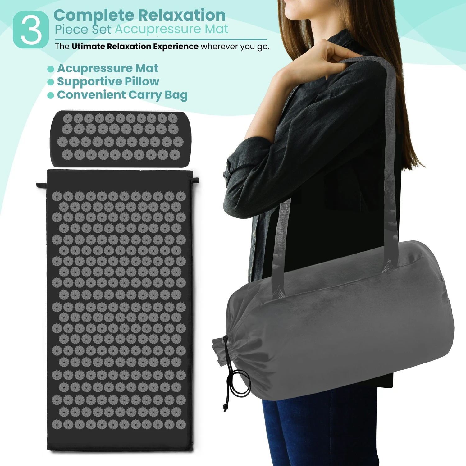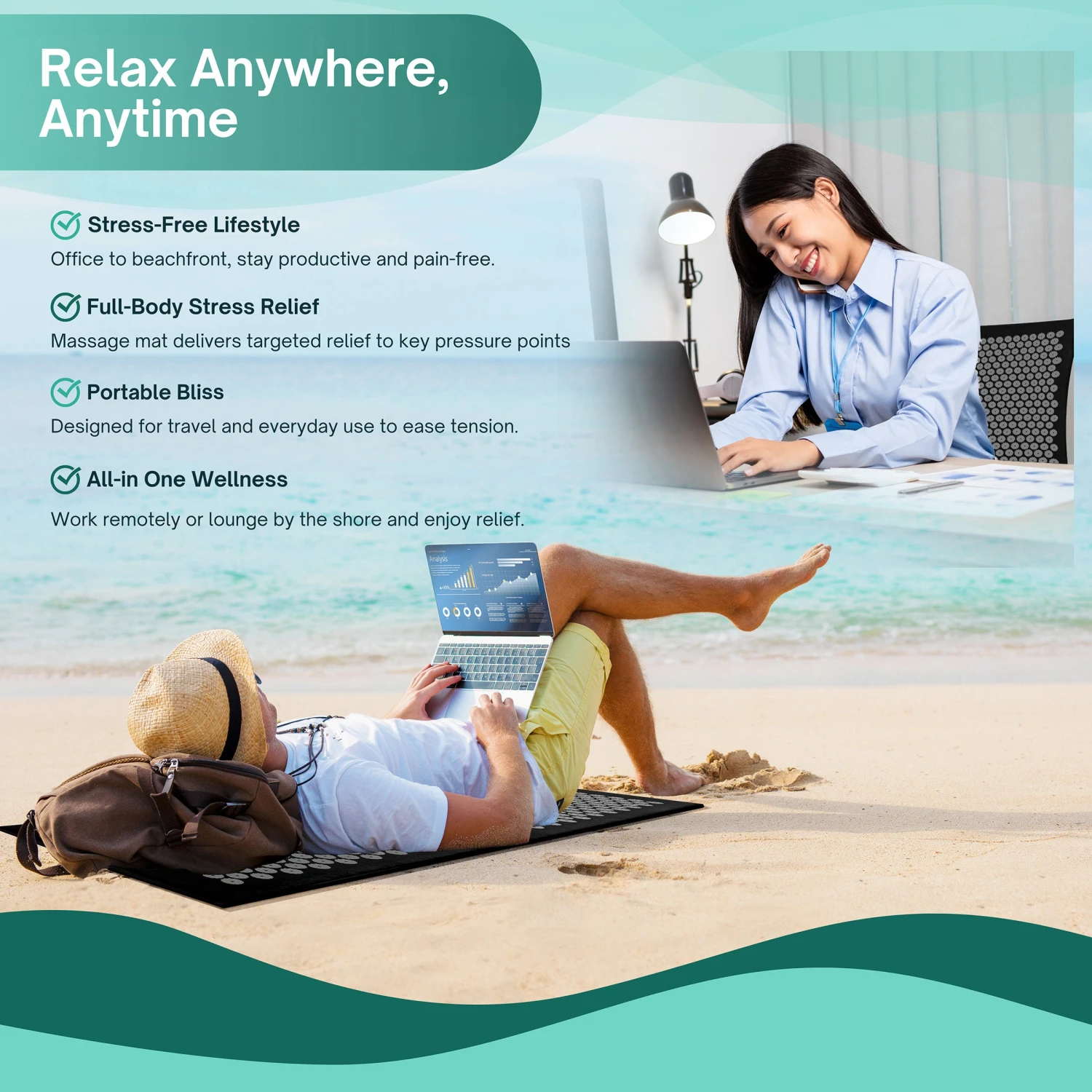 The Sivan Acupressure Mat and Pillow Set helps stimulate positive energy throughout your mind, body, and soul. The pressure from thousands of stimulation points promotes the release of endorphins, enhancing energy, calmness, joy, and pain relief. This set offers numerous health benefits, including improved circulation, better sleep, pain relief, relaxation, and even digestive support. By applying pressure to nerve endings, it encourages blood flow, eases aches and pains, and boosts overall energy levels. Simply lying on the mat for a few minutes can induce deep relaxation and reduce stress. Designed for convenience, it can be used on the floor, bed, chair, or sofa and easily rolls up for travel. FSA and HSA eligible for many health plans.