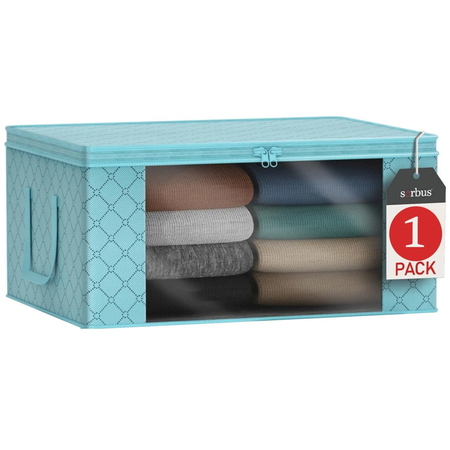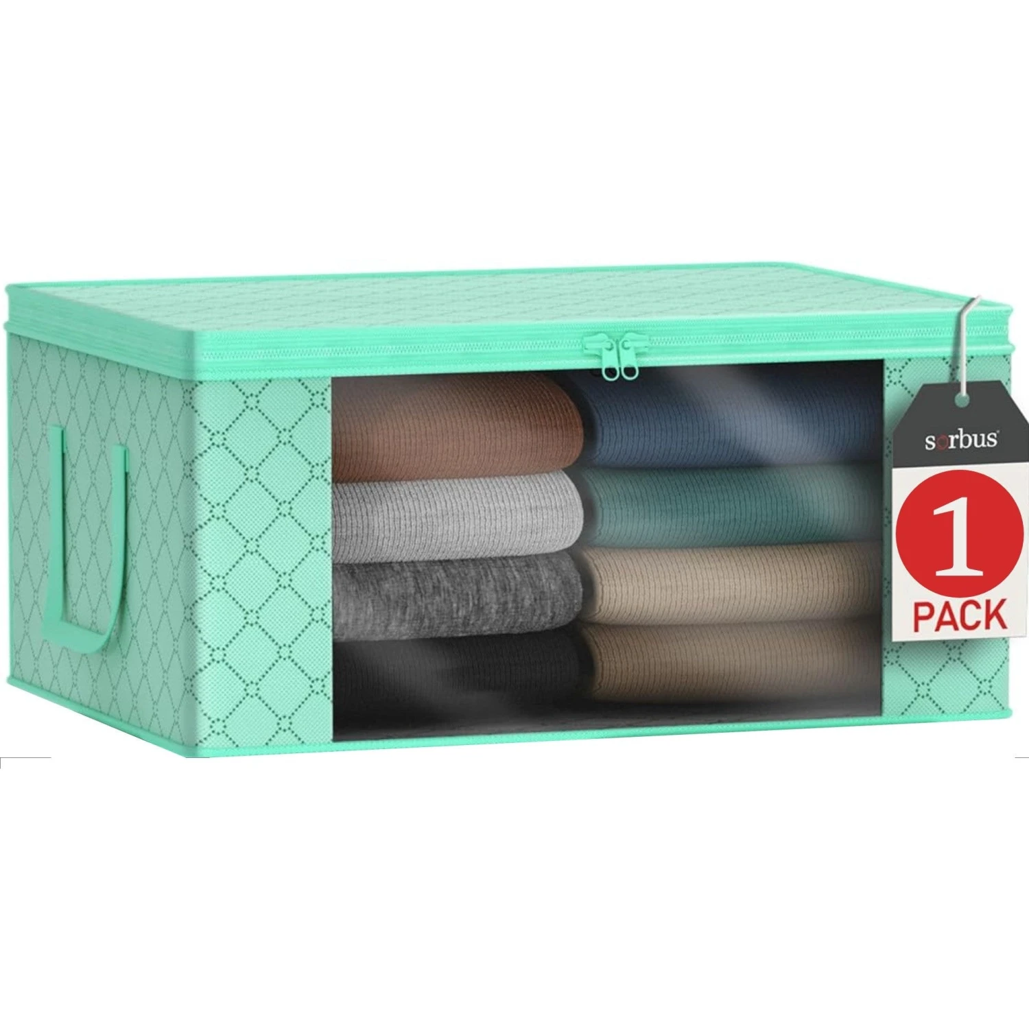 Pack, zip, and transport household essentials with a clear view! The Sorbus Storage Organizer Bag stores and protects your seasonal items and apparel. It features two carry handles and a large transparent front window to see contents at a glance. The generous size compartment provides plenty of room for clothing storage, blankets, linens, holiday decorations, toys, photos, baby clothes, or to use as saree bags. A fully zippered closure helps protect from dust, pests, and water damage while securing contents. For easy transport, the built-in carry handles make this bag portable and convenient. Once filled, it easily fits on shelves, stacks on top of each other, or slides under the bed to maximize space.